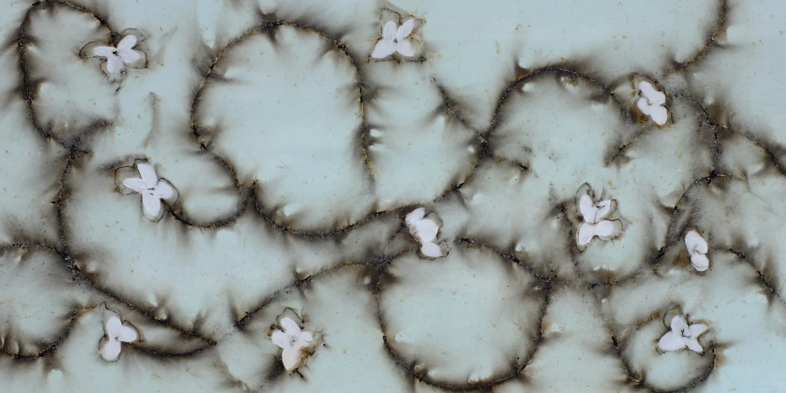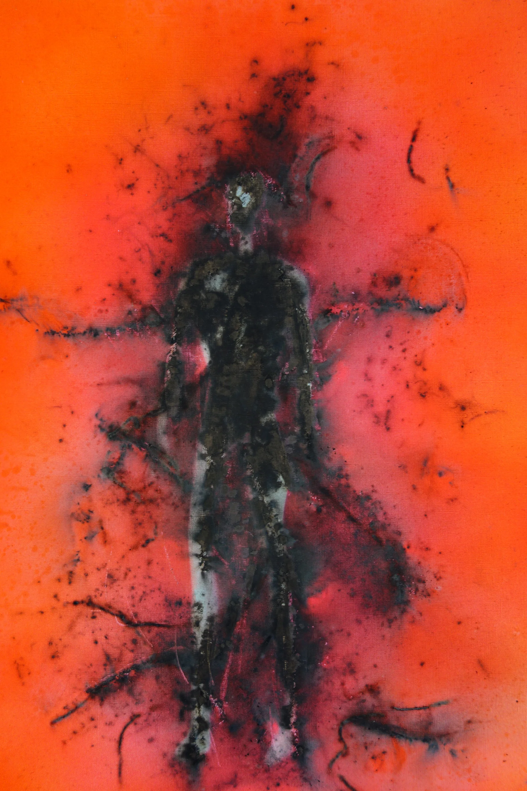 Stick’s mixed media paintings are made by burning various media with high speed fuses and gunpowder. The flame, energy, and inevitable explosion unite nature in a split second of beautiful form, color, and texture.